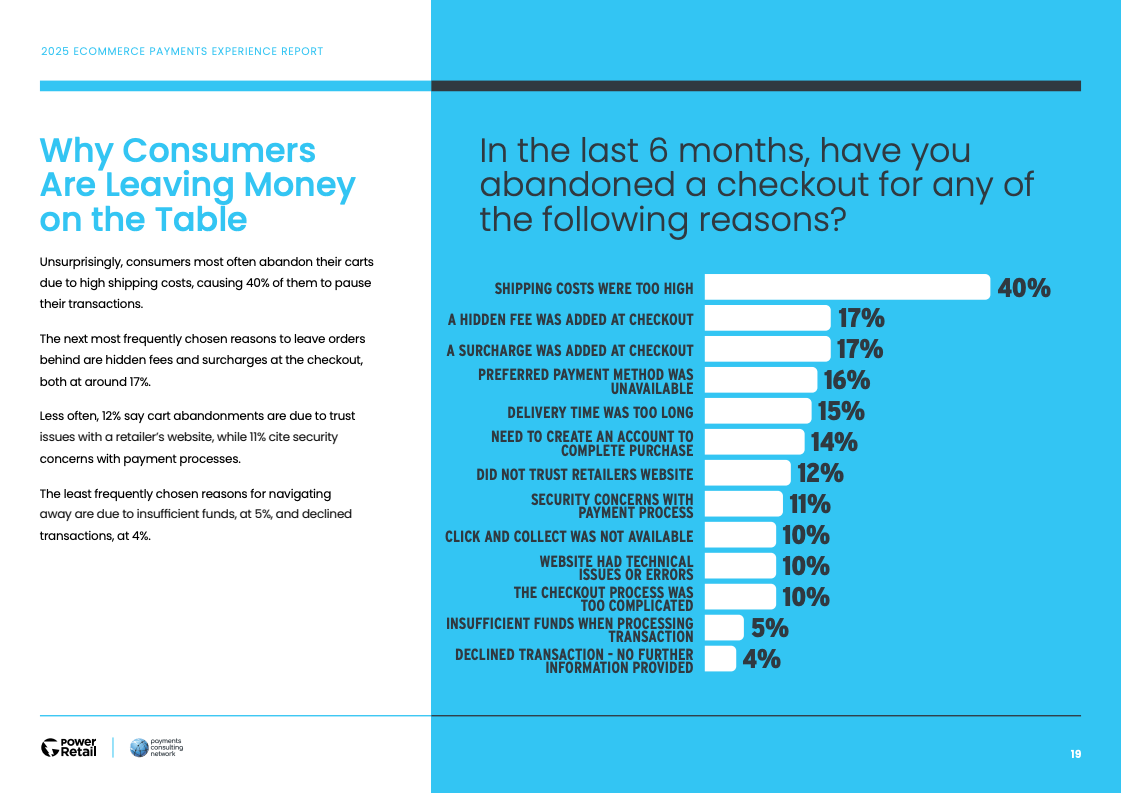 支付环节的信任与透明度是决定交易成败的“最后一公里”。高达40%的购物车放弃率源于过高的运费,而17%则是因为结账时出现的隐藏费用。此外,缺少偏好的支付方式(16%)以及对网站安全性的疑虑(12%)也是导致交易中断的重要因素。这表明,无缝且安全的支付体验是提升转化率的核心。