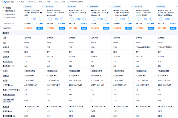 奥迪 A5L Sportback 配置表。