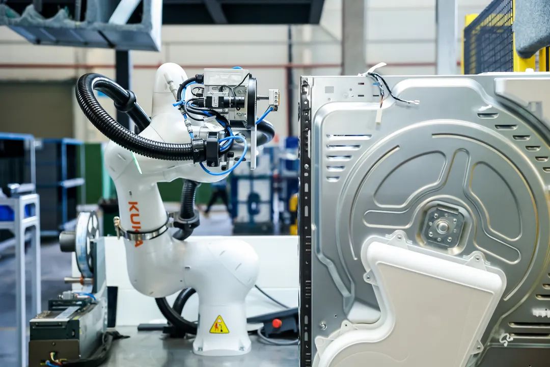 与此同时,在干衣机后盖自动锁附工站,库卡“iico协作机器人”与计划智能体深度协同,通过实时上传到工厂大脑的图片,自动解析机型特征并快速匹配多种产品型号。即便面对不同洗衣机型号的混流生产场景,工厂大脑也能实时完成机型识别,自动更新锁附螺丝的程序,实现如同人类般灵活高效的柔性化作业,让混线生产的精准度与效率得到双重提升。