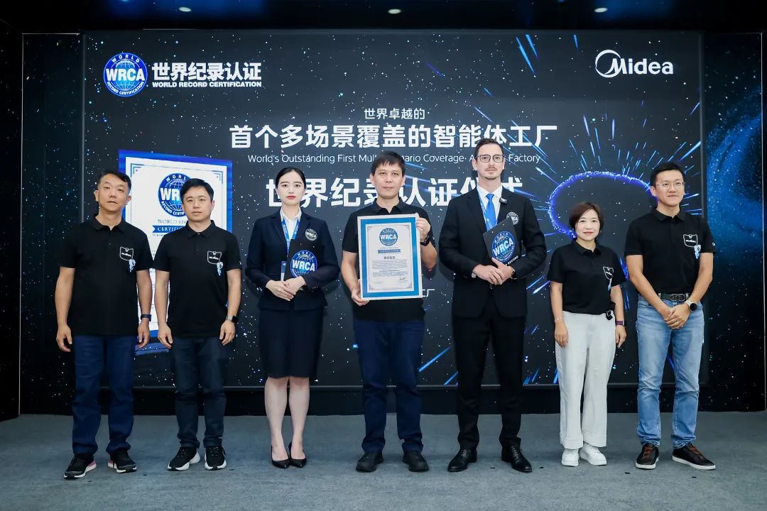 经过现场核查、技术架构剖析及数据验证,WRCA世界卓越认证评审委员会一致认为,美的以“多智能体协同架构”重构生产逻辑,在行业内首次实现覆盖能源、生产、品控、运维等全场景的AI智能体自主服务与协同,其技术架构(Agent自主决策+工业领域大模型融合+具身交互)、场景广度(38个已上线智能体场景)、落地深度(从整个工厂、车间、产线进而深入到工位)均无现有对标案例,定义了生产制造的未来形态——从“数字化工厂”演进为“自主进化型智能体生态”。