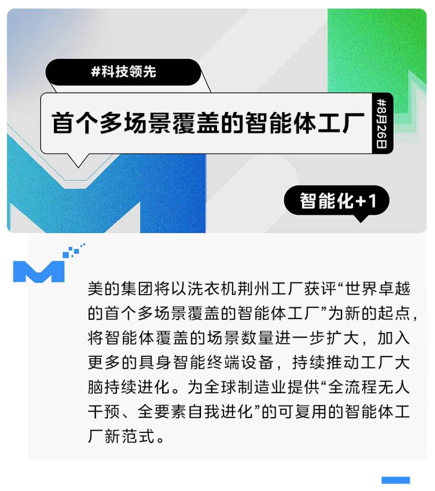 业内人士指出,行业首座智能体工厂的落地,不仅是美的对于智能制造能力进化范式的路径选择,也是AIGC时代“中国智造方案”的全新探索,标志着中国制造从“跟随”到“定义”全球智能制造标准的重大跃迁。美的智能体工厂解决方案覆盖了14个智能体,以“系统自治”替代经验依赖,以实时闭环优化取代事后补救,通过跨场景智能体协同驱动生产效率、柔性化水平和品质管控的范式升级,为全球制造业提供“全流程无人干预、全要素自我进化”的可复用的智能体工厂新范式。