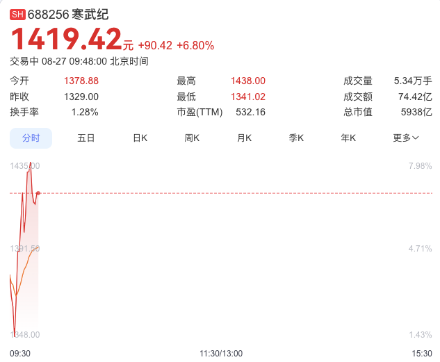 截至8月26日收盘,寒武纪股价最新报1329元,总市值5559.9亿元。今天开盘,寒武纪股价1378.88元,截至发稿寒武纪股价已超1400元,再创新高。