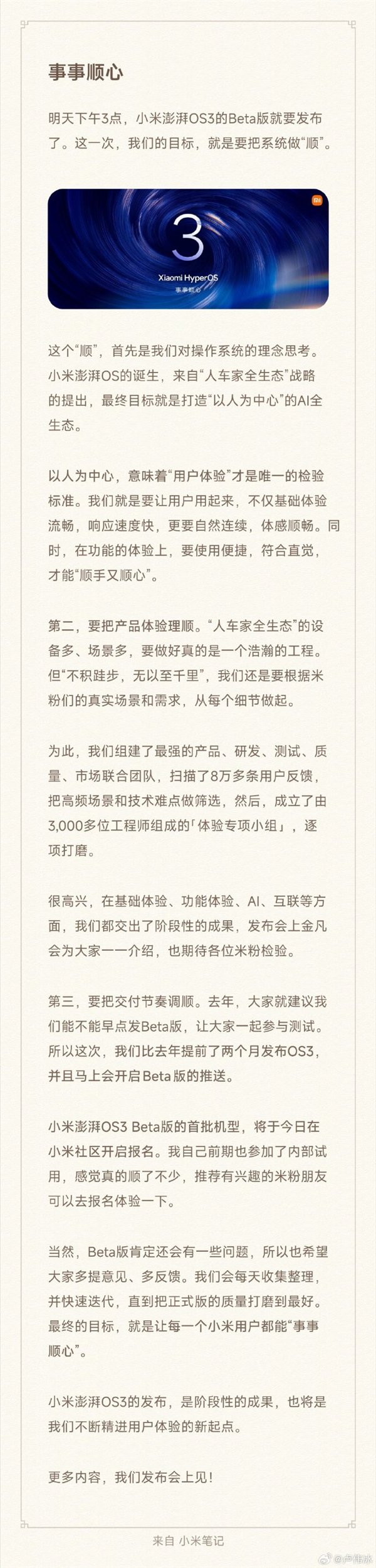 小米集团总裁卢伟冰微博发文表示,小米澎湃OS 3是一个新起点,把系统做“顺”,就是我们的目标。