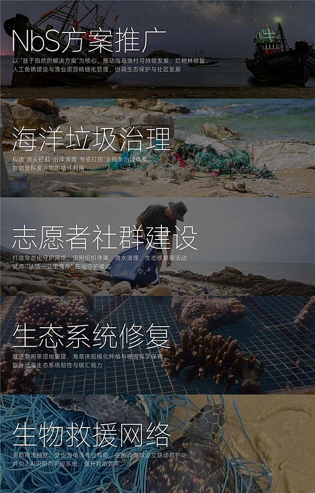 海洋卫士正在探索“海洋保护”新模式,“渔光同行田横岛渔民生态家”计划、“AI助力海洋动物救护系统”是其现阶段正在推动的代表性项目。