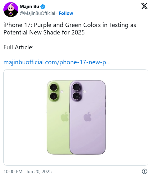 此外,iPhone 17 或推出新配色:紫色与绿色。