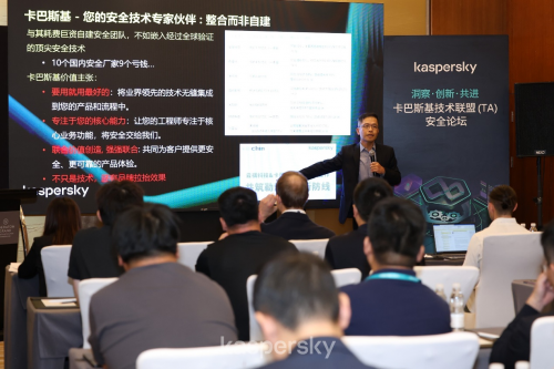 技术交流:共探安全合作新路径在2025卡巴斯基技术联盟(TA)安全论坛的议程中,多位行业领袖与专家围绕零信任架构下的安全建设、威胁态势应对、技术联盟合作等关键议题进行了深度交流。大家一致认为,在网络威胁愈发复杂、客户需求向“整合方案”升级的当下,构建紧密的技术合作联盟、依托情报驱动的安全运营实践,是企业抵御新型威胁、提升安全能力的核心路径。卡巴斯基凭借技术积淀与全球领先的安全能力,与合作伙伴携手共创的生态模式,为行业提供了可借鉴的合作范本。此次论坛的成功举办,不仅凝聚了行业共识,更开启了卡巴斯基技术联盟聚力同行、智赢未来的新篇章。