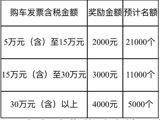 1. 购车发票含税金额为5万元(含)至15万元(不含)的每辆奖励2000元,预计21000个名额;