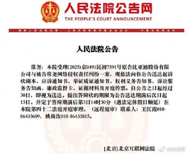 比亚迪已就网络侵权责任纠纷对常尧提起诉讼,案号为(2025)京0491民初7591号。由于无法联系到常尧本人,法院已启动公告送达程序,并将于9月下旬开庭审理。多方猜测,常尧即坦克品牌CEO,目前已处于失联状态。
