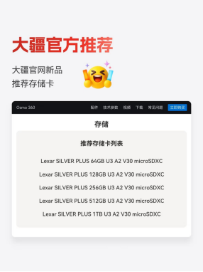 对于性能较强的 Osmo 360 而言,适配一款合适的存储卡十分关键,雷克沙 Professional SILVER PLUS micro 存储卡凭借稳定的性能,成为其适配选择之一。