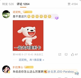 该微博迅速点燃了网友的好奇心,围绕“小狗”的真实身份,各种猜测持续发酵:有人认为这或许是某款新品的内部代号,也有人幽默调侃可能是伞兵为粉丝埋下的“空投”彩蛋。更有粉丝直接晒出京东吉祥物Joy的图片并留言是不是这只,将线索直指京东。更引人注目的是,京东官方账号也同步转发了这条微博,并建议大家打开京东APP搜索「伞兵空投福利」有惊喜。