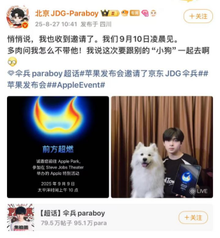 【天极网手机频道】科技春晚要来啦!近日,苹果官宣将在北京时间10日凌晨1点举行秋季产品发布会,预计将推出iPhone 17系列。此消息一出,#苹果发布会定档#立即登上微博热搜,也引发了大家对谁能前往Apple Park的期待。此前知名电竞选手、京东JDG伞兵(朱伯丞)在直播时,已经透露自己将要去苹果发布会现场,并在微博上晒了自己收到的苹果邀请函,甚至还说这次要带着别的“小狗”一起去。