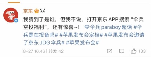 目前一切仍处于猜测阶段,但可以肯定的是,若此次跨界联动成真,将打破科技发布会与电竞圈层的传统边界,为行业品牌营销开辟新路径。据伞兵头部粉丝路透,这次伞兵是代表京东参加苹果发布会,今年在京东买iPhone17会有什么福利呢,我们再探再报。9月10日,我们不仅期待苹果新品的亮相,也密切关注京东JDG伞兵(朱伯丞)与京东是否真将携手步入“未至之境”,为消费者带来双重的惊喜。
