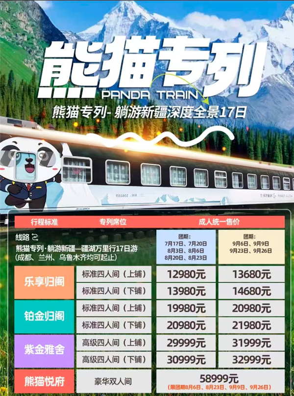 新疆专列旅游中心官方号发布内容显示,售价约6万元的“成都号”车票服务包含:成都至新疆往返16天火车交通、火车标准间住宿、景区内五星级酒店住宿。列车房间配备独立卫生间和大型观景窗。