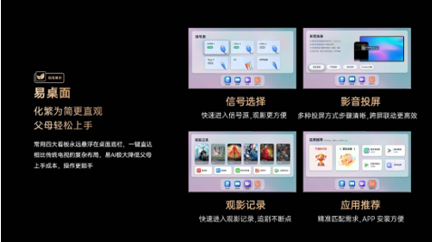首先,在易用性方面,康佳易AI电视的易桌面功能将“选择信号、影音投屏、观影记录和应用推荐”四大核心功能常驻底部导航栏,实现了操作步骤的压缩,2步内完成,让父母能够像使用手机一样轻松上手。语音交互上,搭载AI多方言语音功能,支持23+种方言识别,无论是粤语、四川话还是江浙方言等都能精准捕捉,还可实现多轮流畅对话和模糊搜索,极大降低了父母的使用门槛。