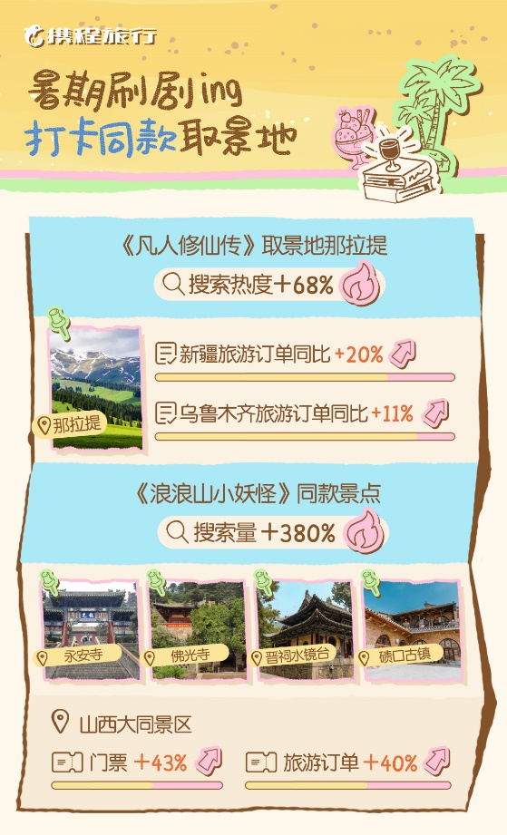 随着电视剧《凡人修仙传》的热播,剧中“人间仙境”的重要取景地新疆那拉提景区爆火,近一个月热度上涨68%。报告显示,暑假期间新疆旅游订单同比增长超20%,乌鲁木齐增长达11%。以江浙沪为代表的南方游客成为赴疆头号粉丝,占据新疆主要客源地前五中的三个席位,其余为北京与广东。适宜的温度与随手一拍便是大片的风景成为吸客的主要因素,来自上海的游客小美表示,“8月上海还是37度的高温,而我已经在新疆赛里木湖赏起秋景了。”