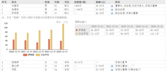 而在公司利润大幅增长的背景下,公司高管薪酬却纷纷下降。罗明亮2024年薪酬为40.34万元,相较于2023年的48.45万元,下降了8.11万元,是去年高管薪酬降幅最大的。尽管如此,罗明亮去年薪酬仍是公司高管中最多的。董事长兼总经理刘建军去年薪酬36.02万元,而另一位副总经理吴康林薪酬仅为33.65万元,近五年薪酬从未高于40万元。