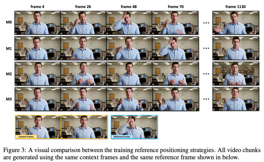最终被采纳的 M3 策略,通过在训练中从邻近分块(adjacent chunks)中采样参考帧,找到了一个 “最优平衡点”(optimal equilibrium)。这种策略既能确保模型在视觉上遵循源视频的风格,又能赋予模型根据音频动态生成全身动作的自由。