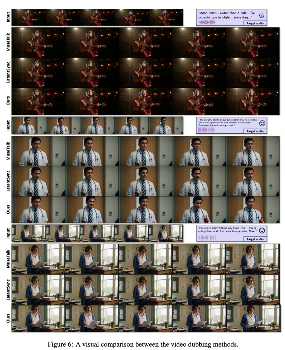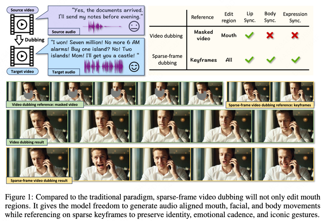 长期以来,video dubbing 一直面临一个核心的 “僵局”—— 其编辑范围的局限性。传统的 video dubbing 技术,例如 MuseTalk 和 LatentSync,通常专注于对嘴部区域进行 “修复式” 编辑,以实现口型与新音频的同步。这种方法的主要局限在于,它几乎不触及人物的面部表情、头部转动和肢体动作。