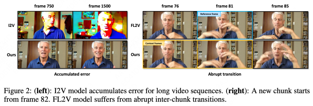 其次是基于首末帧转视频(First-Last-frame-to-Video, FL2V)的方法。该方法试图通过同时使用视频片段的起始帧和终止帧作为参考来解决累积误差。然而,这种策略带来了另一个问题:过渡生硬, 如图 2(right)。FL2V 模型生成过程缺乏从前一片段向后一片段传递的 “动量信息”,不同视频片段之间的动作衔接会显得突兀和不自然,打破了视频流的连续性。与此同时,其过于严格地遵循固定的参考帧,强制生成的视频在片段(chunk)的边界上精确复制参考帧的姿态,即使这种姿态与新音频的情感或节奏相悖。