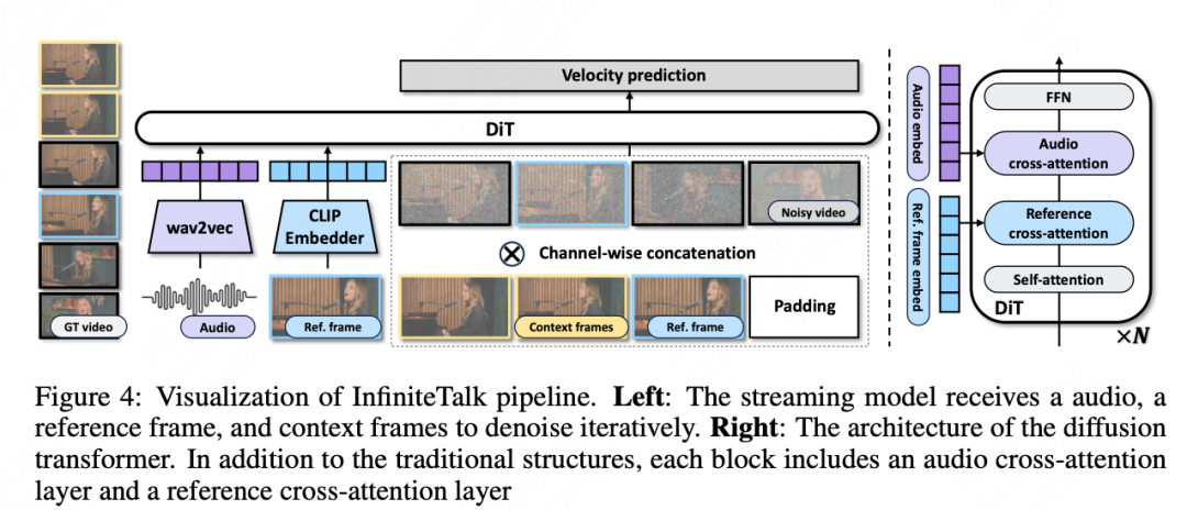 为了应对无限长度的视频序列生成任务,InfiniteTalk 采用了流式(streaming)生成架构,整体网络框架如图 4 所示。其工作原理是将一个超长视频分解为多个小的、可管理的视频片段(chunks),然后逐一进行生成。然而,与简单的分段生成不同,InfiniteTalk 的核心在于其精巧设计的 “上下文帧”(context frames)机制。