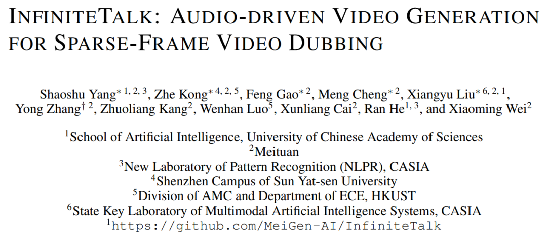 InfiniteTalk 是由美团视觉智能部主导研发的新型虚拟人驱动技术,技术论文、代码、权重已开源。 美团视觉智能部能围绕丰富的本地生活电商场景,建设从基础通用到细分领域的视觉技术能力,包括视觉生成大模型、多模交互虚拟人,助力营销创意生产和商家低成本直播;文档、商品、安全多模态大模型,助力商家开店经营、平台商品治理和违规账号治理;人脸识别、文字识别、细粒度图像分析、高性能检测分割、街景理解成为公司基础设施能力。