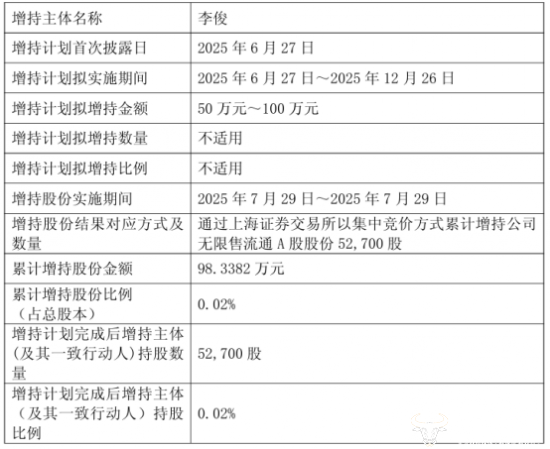 值得一提的是,今年7月,李俊以集中竞价交易的方式增持公司5.27万股份,累计增持金额98.34万元,这是他自2024年减持公司股份后,再次持有公司股份。