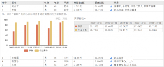 在公司营利双增的情况下,公司高管薪酬纷纷上涨。李俊2024年薪酬为90.71万元,相较于2023年的67.64万元,上涨了23.07万元,是高管中薪酬涨幅最大,也是去年高管中的最高薪酬,比董事长刘会平还高。