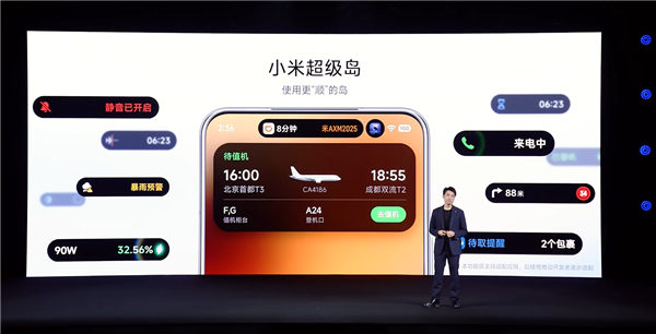 根据官方演示,小米超级岛可显示充电功率、充电电量、待取快递提醒、登机提示、天气预警、打车信息、导航、倒计时、手机状态等信息。