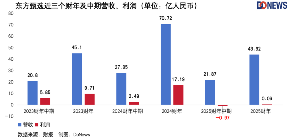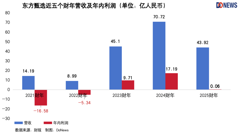 近五年,东方甄选的营收和利润经历了大起大落,2025财年的表现同步大幅下滑,但这有个前提,即东方甄选主动剥离了与辉同行的影响(2024年7月25日)。彼时外界议论纷纷,但这实际上是对于双方最好的选择(“体面分手”后,新东方爬出低谷 | DoNews财经),其决定性因素有三: