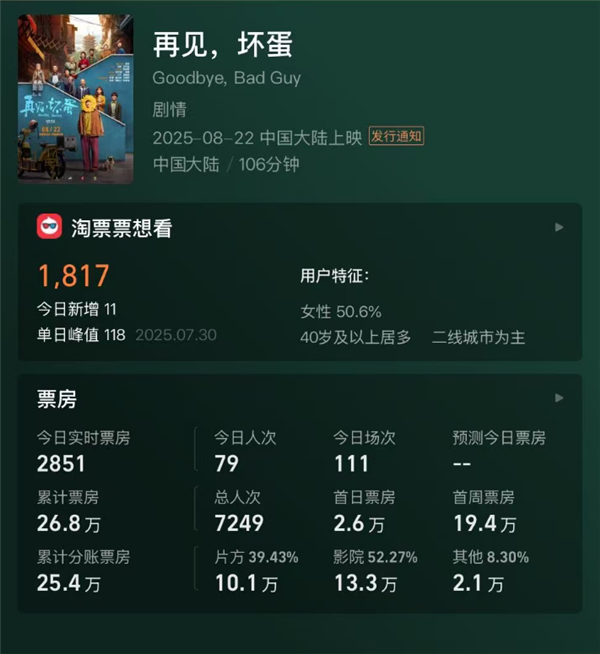 电影《再见,坏蛋》于8月22日上映,上映6天票房仅26.8万元。