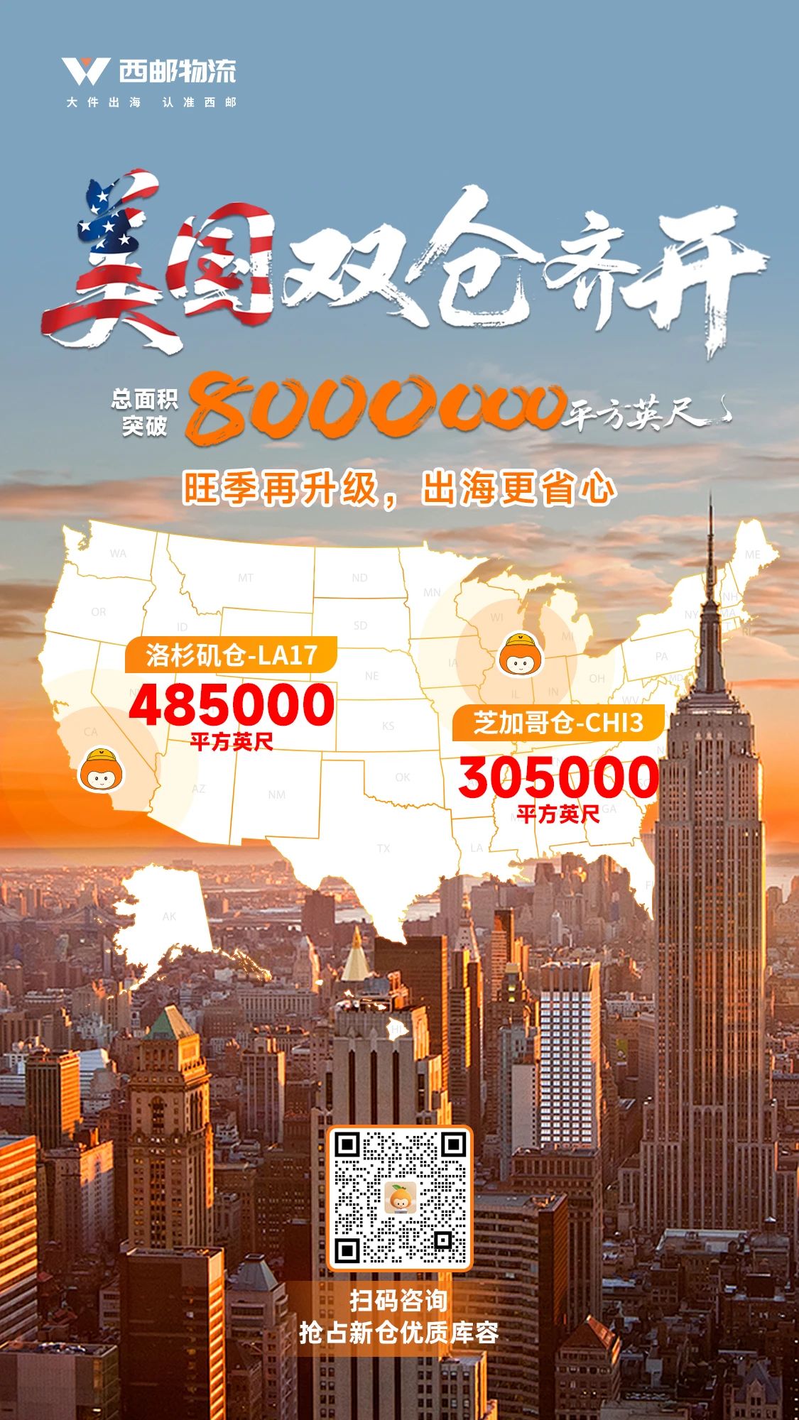 【亿邦原创】8月28日消息,头部跨境物流商西邮物流官方宣布,为迎接2025年末大促季,其在美国洛杉矶和芝加哥同步启用LA17与CHI3两大新海外仓,两仓总面积达80万平方英尺。