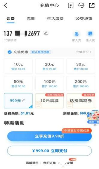 打开中国移动APP充值界面,指尖输入任意数字,8.8元救急、188元心意、327元精准报销……无论充多少,它都能秒到账,余额有零有整,实在是非常人性了。