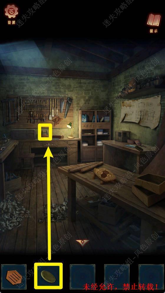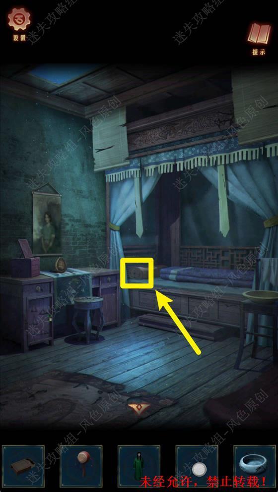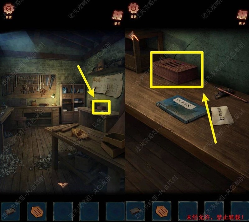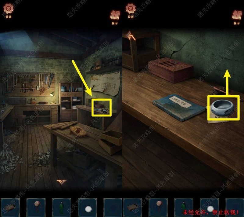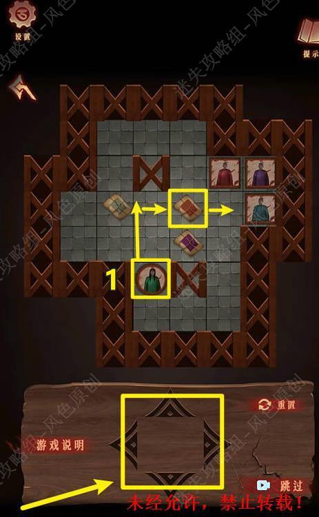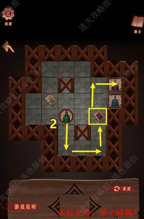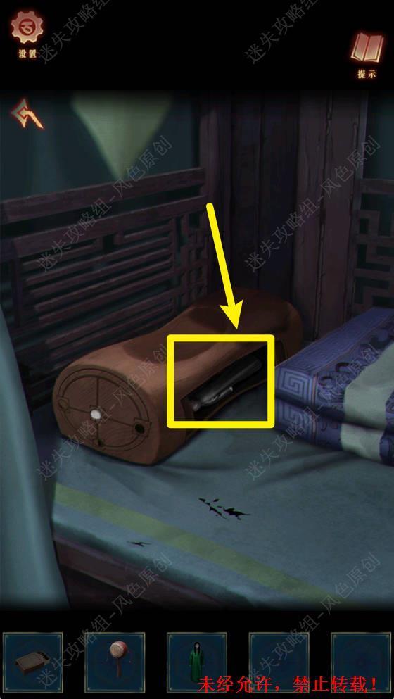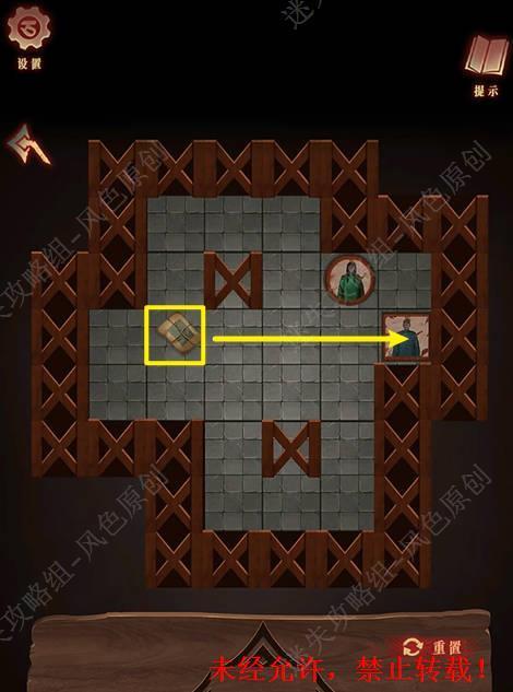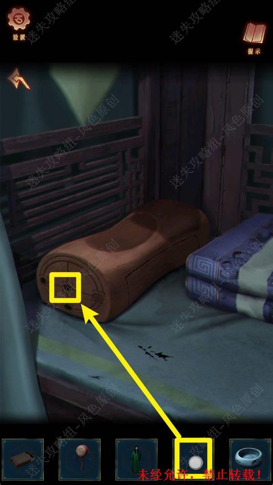 中央的白色石块象征着房屋大厅的位置。按照方位,大厅左侧为木工房,右侧是卧室,下方则是院子。根据木工房中猴子捞月的提示,以及卧室和院子中笔洗倒影的线索,将枕头上的三处方块调整成所示的样式。