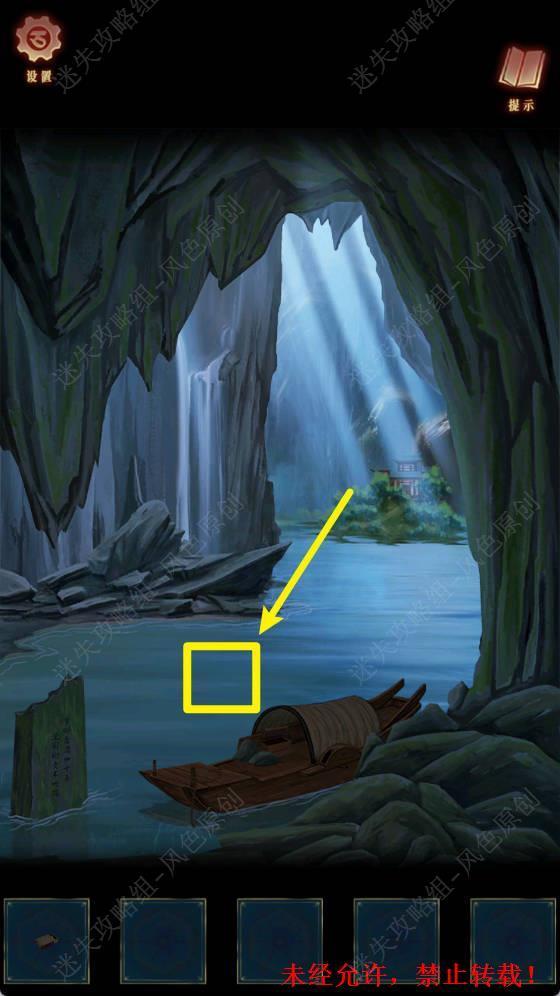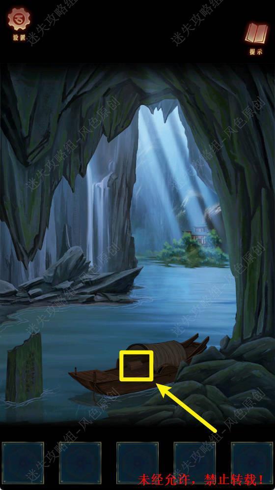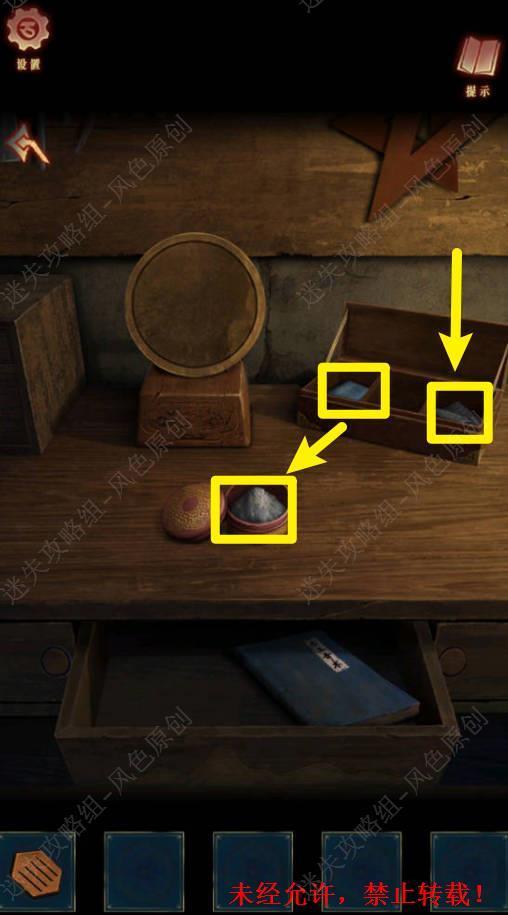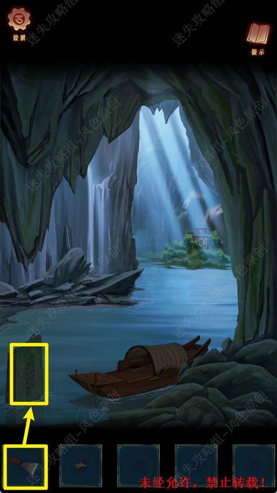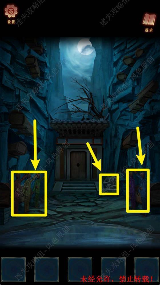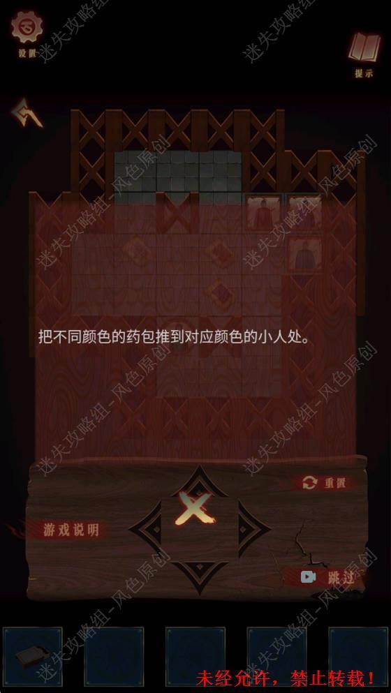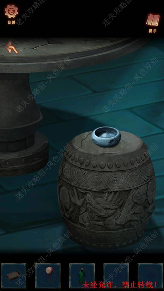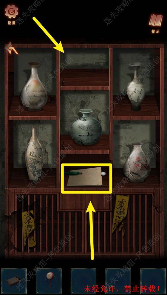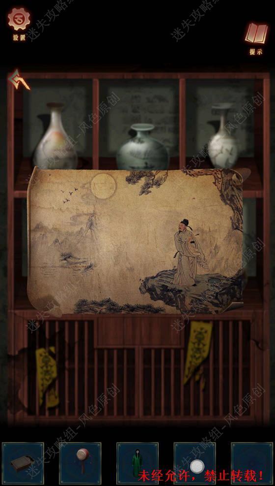 根据山水画的提示,把五个瓶子放到正确位置,取得下方的绿色人偶和白色圆形石块,并查看图画。