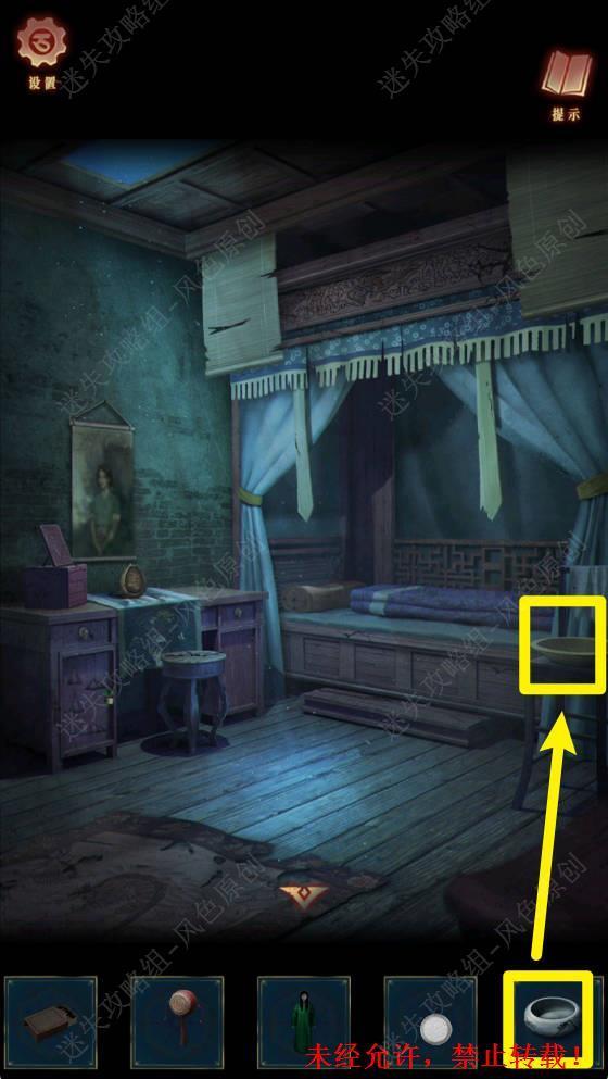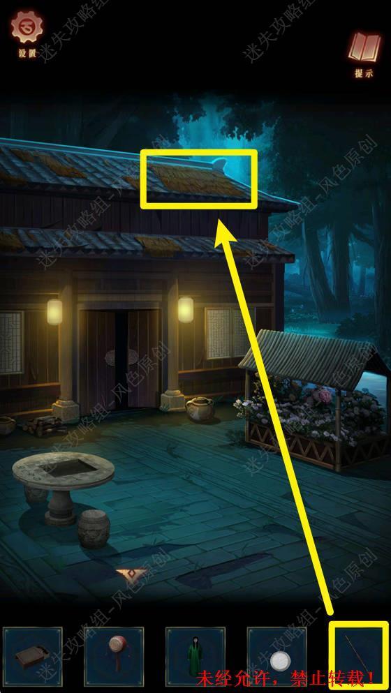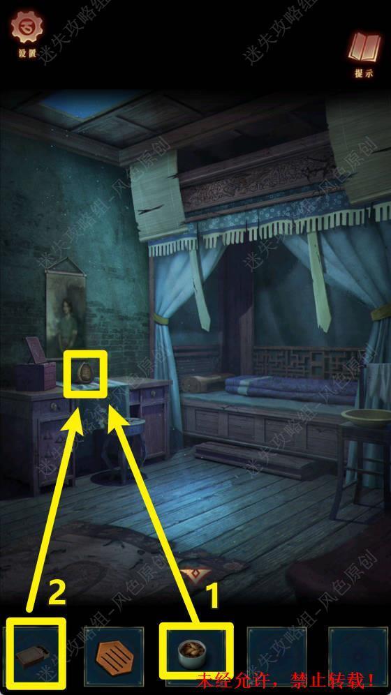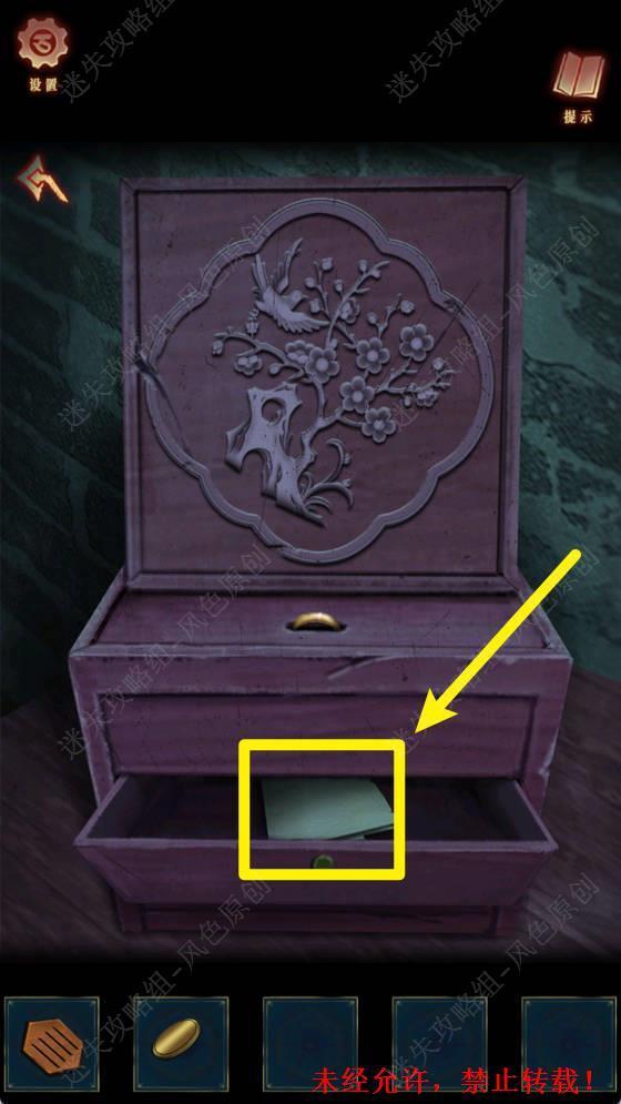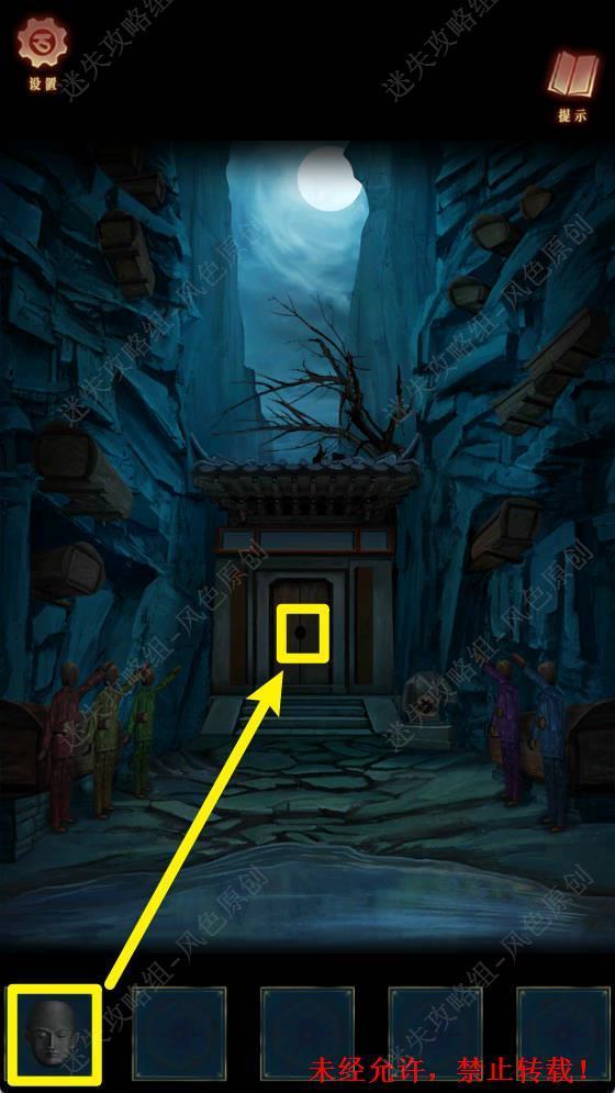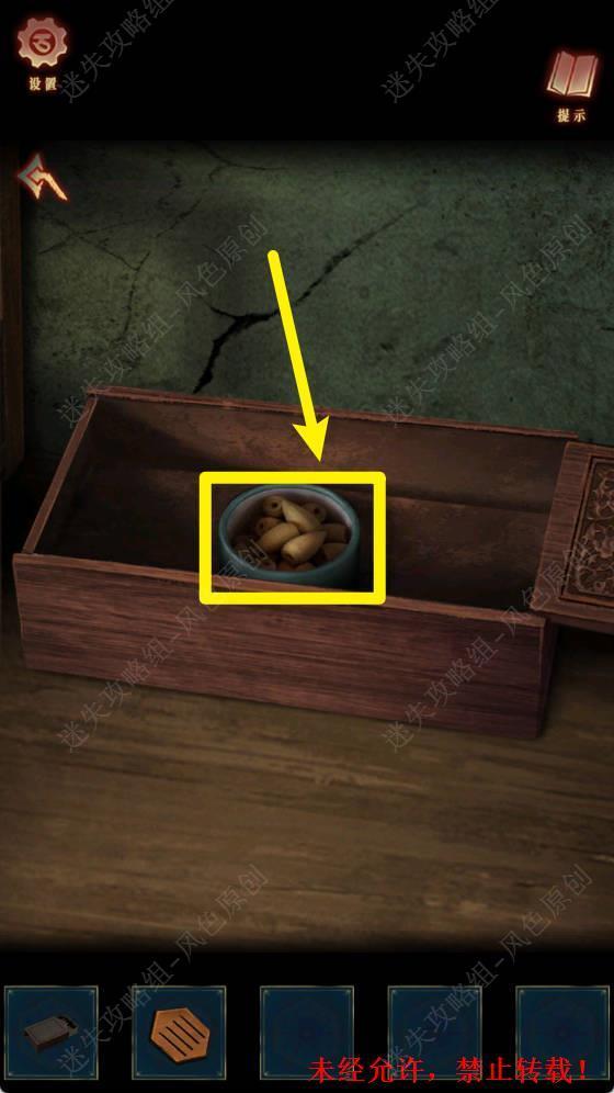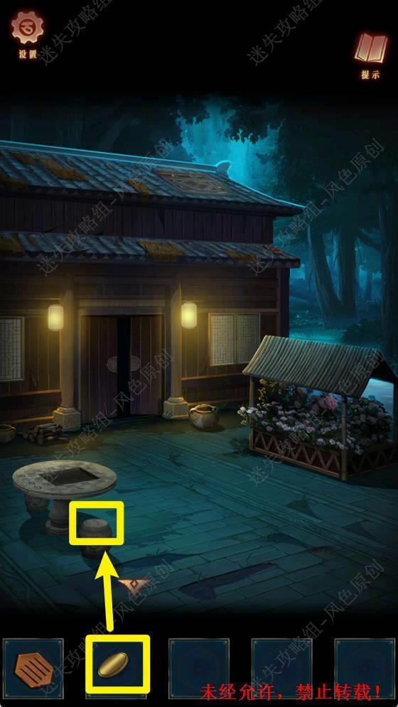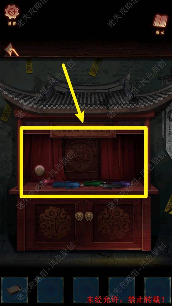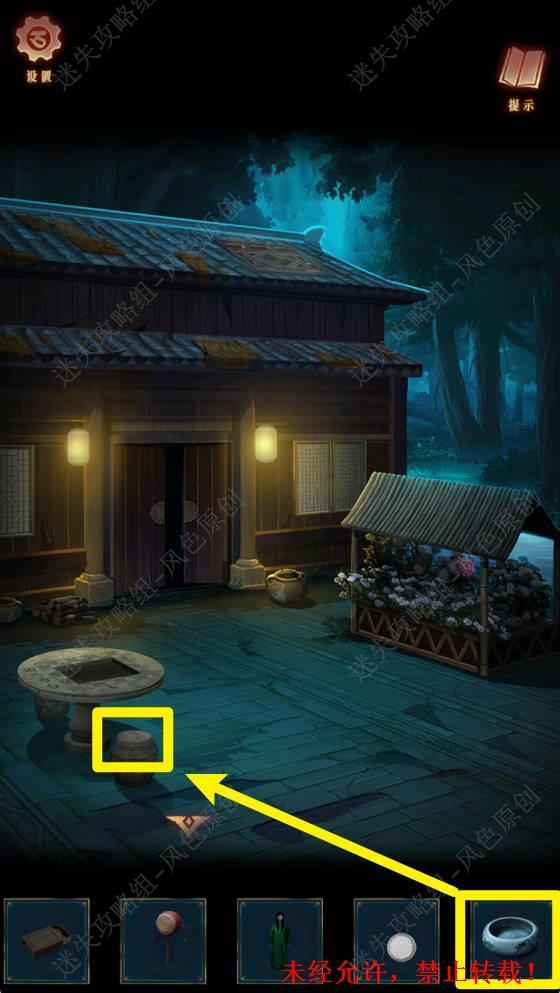 根据山水画的提示,把五个瓶子放到正确位置,取得下方的绿色人偶和白色圆形石块,并查看图画。
