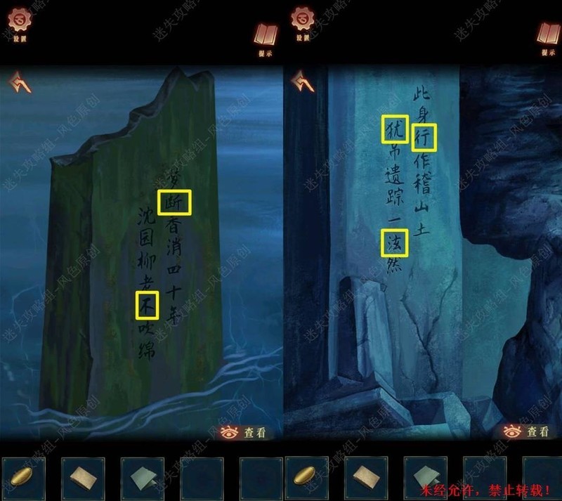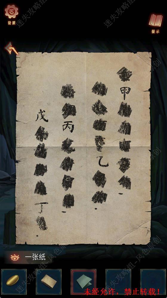 查看物品栏中的,根据线索提示,将纸上甲乙丙丁戊的位置与两处石碑上相应位置的字对照,可得出甲乙丙丁戊分别对应的是断、不、行、泫、犹。