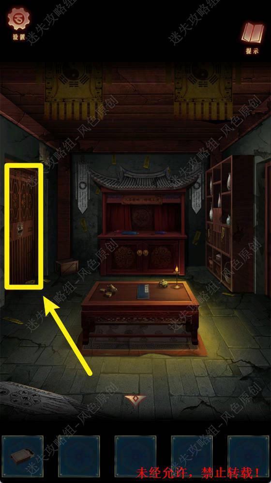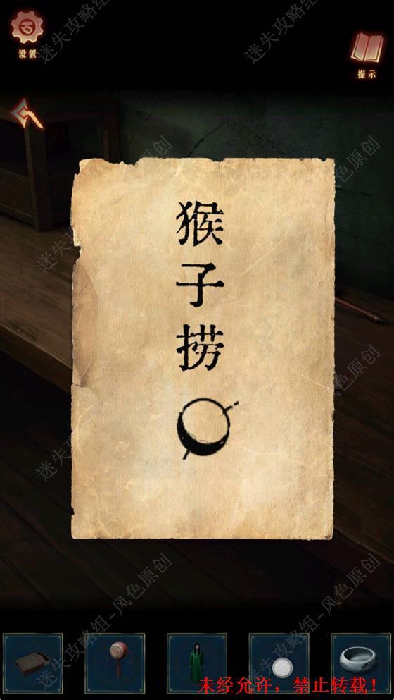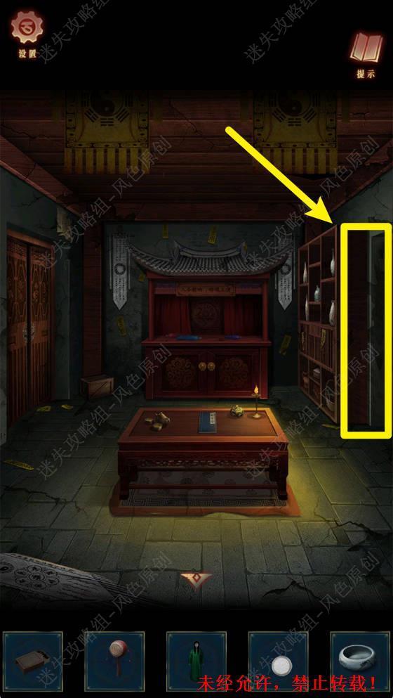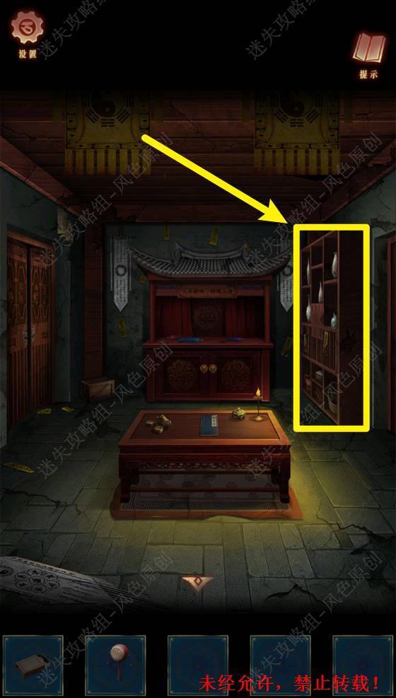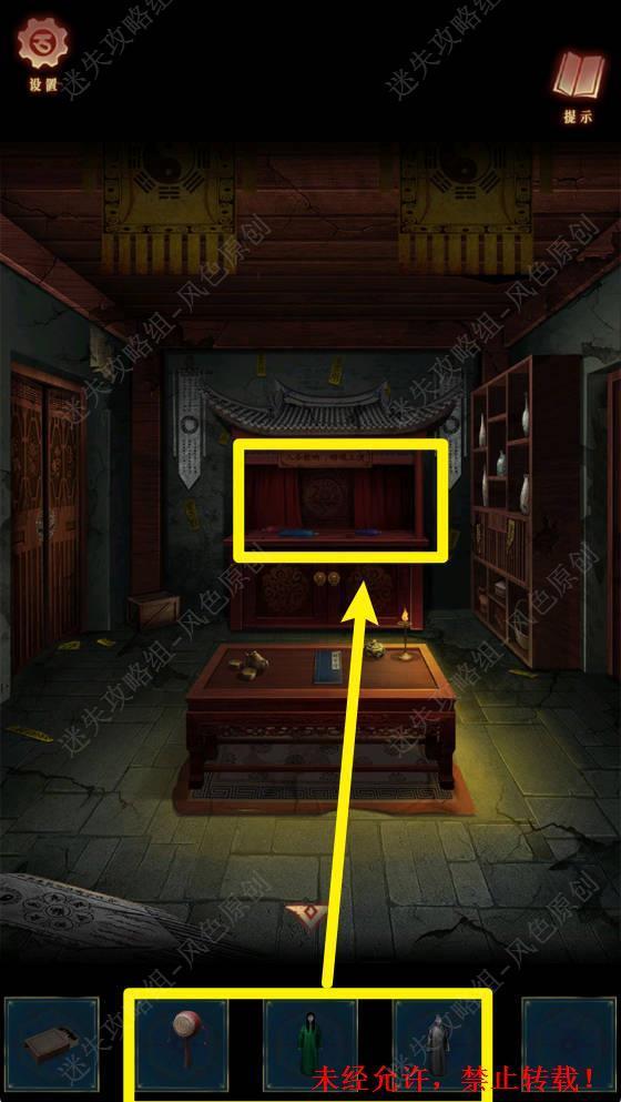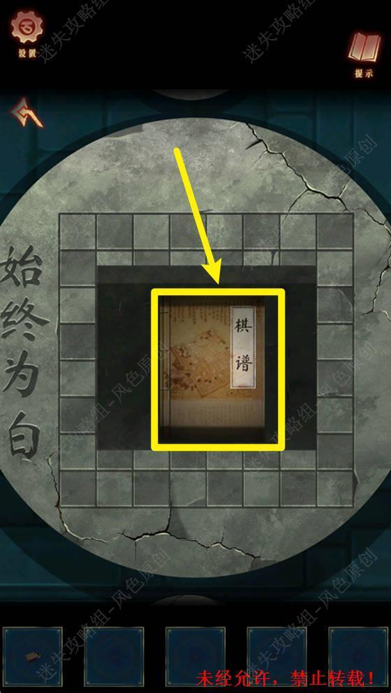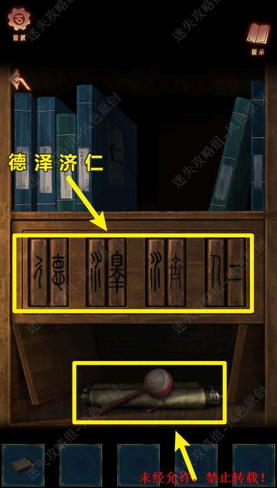 点击书架上的书,可见封面文字为德、泽、济、仁。根据这一提示,调整下方八个牌子,随后取得拨浪鼓,并查看山水画。