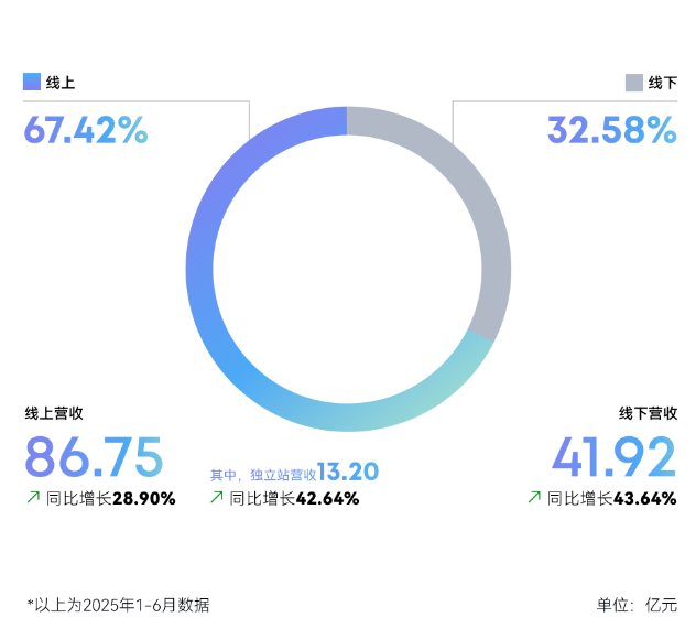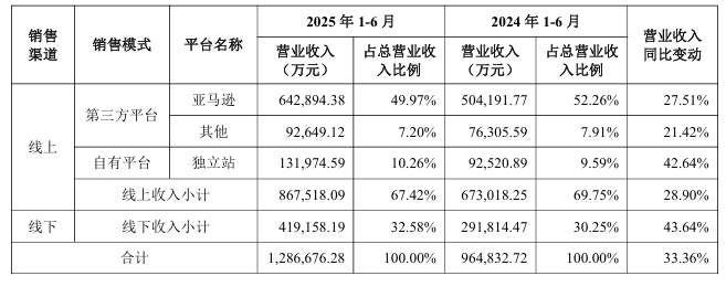 报告期内,线上渠道为安克创新贡献了高达86.75亿元的营收,同比增长28.90%,占据总营收份额的67.42%;而线下渠道的营收为41.92亿元,同比增长43.64%,占据总营收份额的32.58%。
