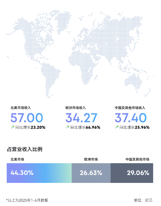 分地区市场来看,2025年1-6月,安克在北美市场取得了57.00亿元营收,同比增长23.20%,占据总营收的44.30%;欧洲市场发展迅猛,贡献了34.27亿元营收,同比暴增66.96%,占据总营收的26.63%;中国及其他市场营收为37.40亿元,增幅达25.96%,占据总营收的29.06%。