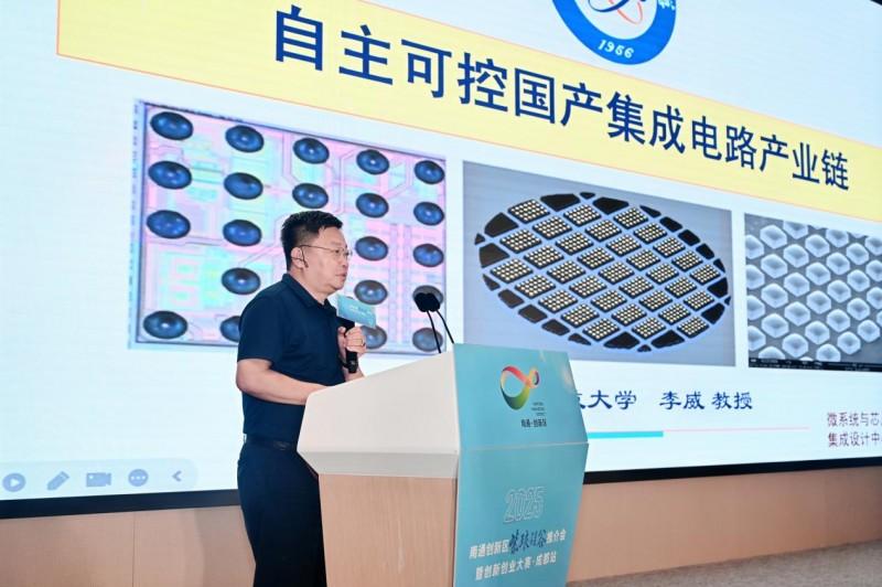在主旨演讲环节,多位集成电路领域的行业领袖齐聚一堂,分享了前沿观点与实战智慧。成都市硅海武林科技有限公司董事长、创始人,成都华微电子科技股份有限公司创始人李威,结合数十年一线产业经验,为创业者系统梳理了从技术攻坚到市场落地的关键路径与实用策略。新芒基金副总经理郭纹伶则以《新质生产力背景下的集成电路企业融资之路》为题,从投资机构视角出发,分析了当前产业资本动向与企业突破融资瓶颈的有效途径。天芮科技(南通)有限公司董事长康毅进与南通星锐信科技有限公司总经理罗敏作为已成功落地南通的成都校友企业家代表也登台分享了选择南通创新区的初心与体验,他们作为来自成都的杰出校友企业家代表,从政策支持、服务效率、产业配套等方面讲述了真实的“南通落地感”,为更多有意向的企业提供了生动参考。