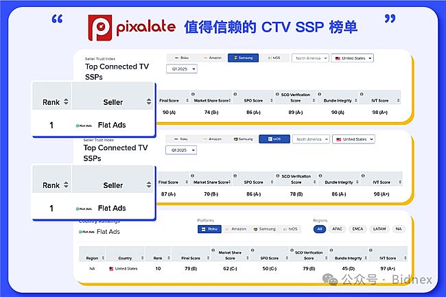 近日,全球领先的流量监测平台 Pixalate 发布了2025年第一季度"值得信赖的 CTV SSP"榜单。Bidnex 凭借在 Roku TV、Samsung TV+ 及 Apple TV 三大平台的卓越表现,成功跻身榜单前列,充分展现了在 CTV 领域的专业实力。