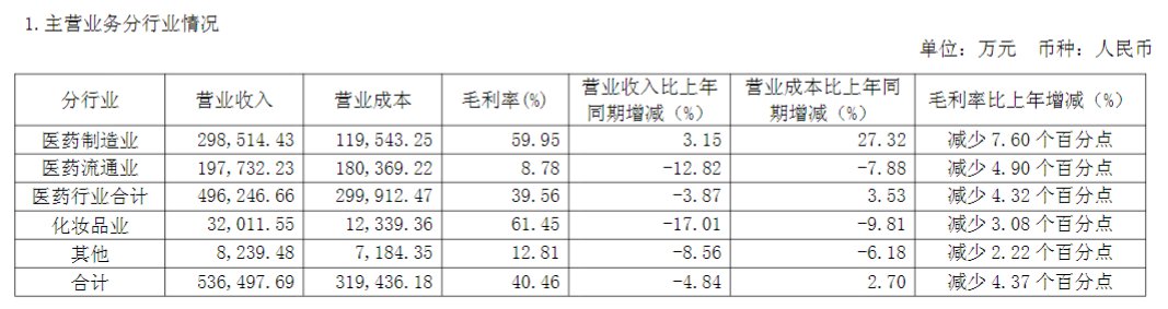 主营业务分行业看,半年报指出,上半年,片仔癀在医药制造业营业收入29.85亿元,同比增加3.15%,毛利率为59.95%,比上年减少7.60个百分点;医药流通业营业收入19.77亿元,同比减少12.82%,毛利率为8.78%,比上年减少4.90个百分点;化妆品业营业收入3.20亿元,同比减少17.01%,毛利率为61.45%,比上年减少3.08个百分点;其他行业营业收入8239.48万元,同比减少8.56%,毛利率为12.81%,减少2.22个百分点。公司整体毛利率为40.46%,比上年减少4.37个百分点。
