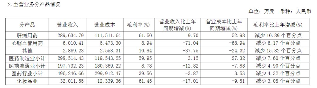医药制造业方面,分产品看,报告期内,肝病用药营业收入28.96亿元,同比增长9.70%,毛利率为61.50%,比上年减少10.89个百分点;心脑血管用药营业收入6010.41万元,同比减少71.04%,毛利率为8.94%,比上年减少6.17个百分点。