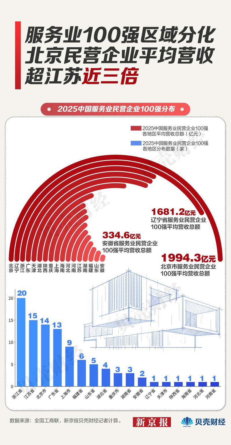 从数据看,服务业100强企业的平均营收额超过1000亿元,其中北京、辽宁、浙江、广东、天津、湖北等六省份平均营收超过全国水平,北京平均营收高达1994.30亿元,仍居首位。浙江、江苏、北京、广东企业数量超过10家,总计62家,占比超六成。江苏企业数量虽排在第二,但平均营收仅505.63亿元,缺乏头部企业支撑。