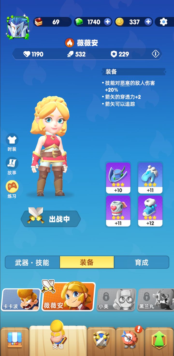 装备方面,金币购买了不少,如果没有获得可能是还没打到对应关卡,继续推进即可。对于冰弩职业来说,优先强化头盔和衣服部位,凑齐一套更佳,选择带有追踪和穿透属性的装备。初始可以从3星的白、绿或蓝色装备开始培养,升到10级后可进阶为绿色、蓝色或紫色装备,不同品质的装备词条数量和基础属性也不同,高阶装备暂时没拿到的话可以先不考虑。建议从3星蓝色装备入手,其他装备暂时不需要升级。后期可通过装备吞噬来提升战力,吞噬一件10级装备比用10件1级装备吞噬节省很多资源,效果也更明显。手套和鞋子部位可以搭配出不同的元素效果,如冰、火、毒、电和物理等,可根据个人喜好进行选择和搭配。