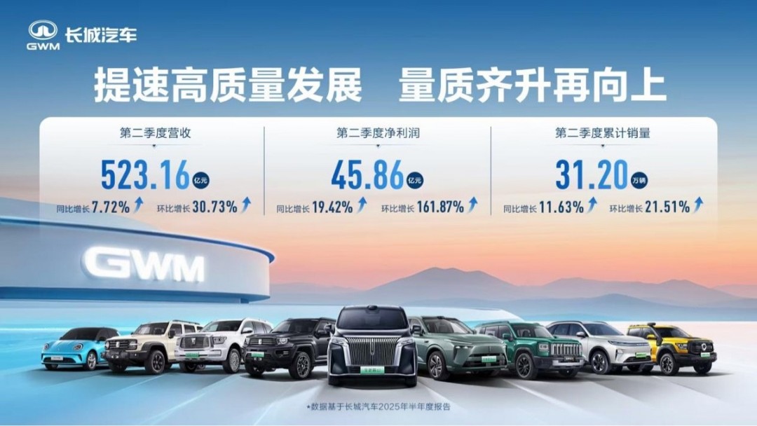 【TechWeb】8月30日消息,长城汽车日前公布了2025年第二季度财报。二季度长城汽车实现营收523.16亿元,同比增长7.72%,环比增长30.73%,为历史最佳第二季度营收表现;二季度净利润45.86亿元,同比增长19.42%,环比增长161.87%,为历史最佳单季度净利润表现。
