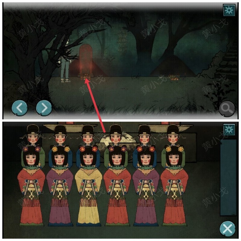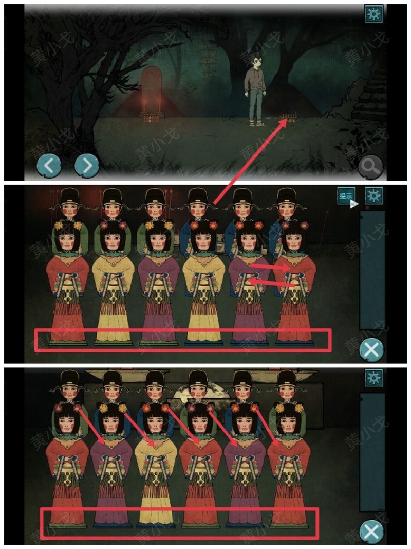点击右侧墓碑前的纸人,参照左侧纸人的排列,将右侧纸人依次调整为以下顺序:红衣头花黄、黄衣头花紫、紫衣头花黄、黄衣头花红、红衣头花紫、紫衣头花红。调整完成后将触发剧情。(排列规律为:女纸人裙摆颜色对应男纸人衣服颜色,左侧女纸人头花颜色为右侧女纸人衣服颜色)