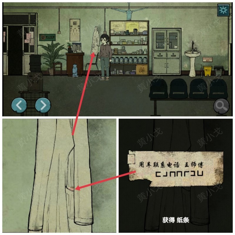 在诊所场景1中,点击墙上挂着的白大褂,从口袋中找到一张纸条。