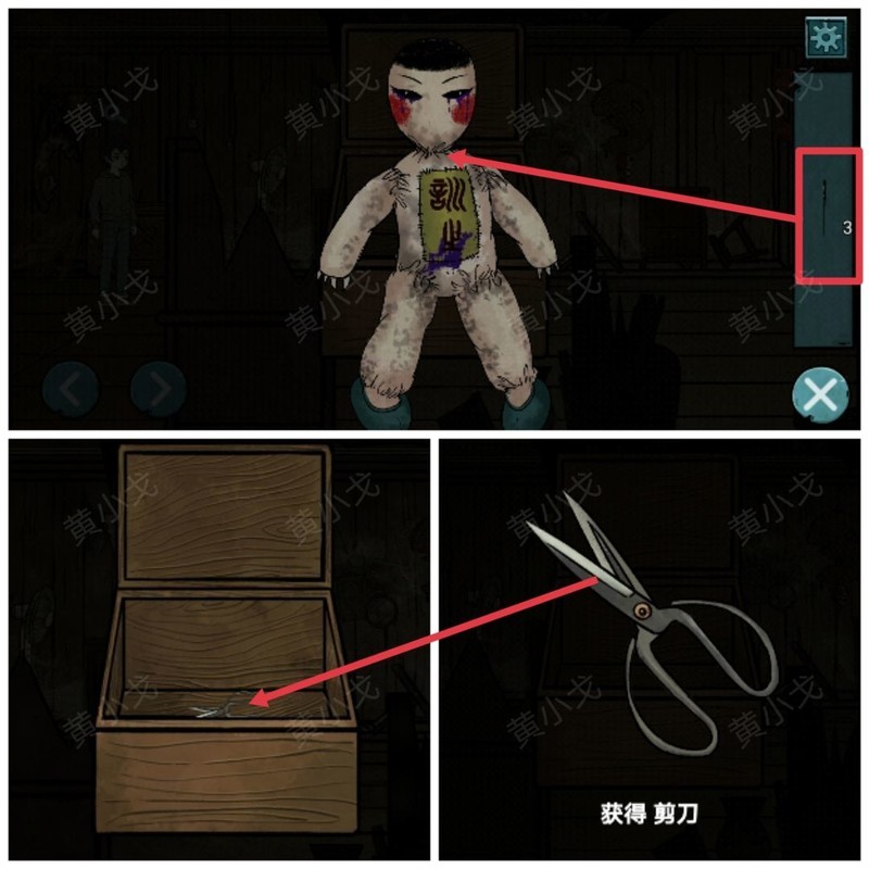 用银针刺人偶,在箱内取得剪刀。