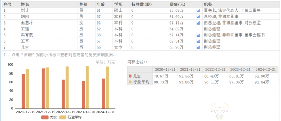 但在去年公司净利润下降的背景下,公司副总们薪酬多数都上涨了。尤宏2024年薪酬为68.90万元,相较于2023年的63.81万元,上涨了5.09万元,是公司涨薪最多的,也是公司副总队伍中的最高薪酬。其他副总王慧玲、冯育菠、王军去年薪酬分别增长2.26万元、1.68万元及1.40万元。副总王强今年5月份刚刚担任副总经理一职,暂无薪酬变化。